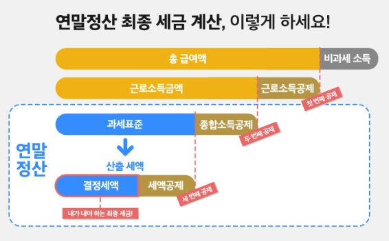 • 요약하자면 이미 납부한 세금을 다시 계산해서 최종적으로 올해 납부할 세금을 확인, 정산하는 게 "연말정산"입니다.
