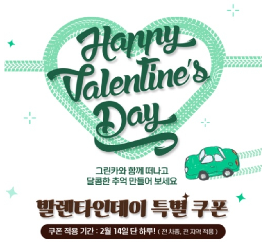 카셰어링 그린카에서 2.14일 발렌타인데이 특별 이벤트를 진행한다고 합니다. 그린카와 함께 떠나고 달콤한 추억을 만들어보라는 의미에서 특별 쿠폰 이벤트를 합니다. 그린카는 카셰어링 서비스를 제공하고 있으며 렌트카와 차이는 분 단위로 대여할 수 있고 24시간 비대면으로 대여를 하는 방식입니다.