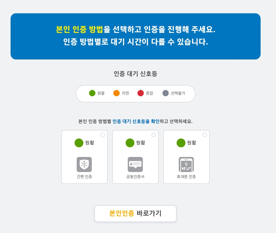 3.본인인증을 실시해야 하는데 본인인증 방법은 [간편인증] [공동인증서] [휴대폰인증] 이렇게 있으며 인증 대기 신호등을 확인하시고 [원활]한 곳에서 인증을 실시하시면 됩니다.