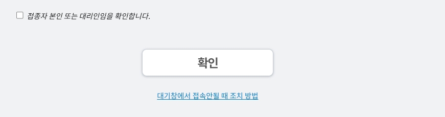 2.홈페이지에 접속하셔서 스크롤을 아래로 내리면 [접종자 본인 또는 대리인임을 확인합니다.] 라는 문구를 체크하시고 [확인]을 눌러줍니다.