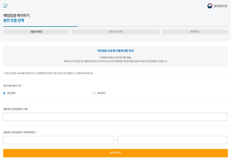 4.본인인증을 하게 되면 [예방접종 예약하기]가 나오게 되며 [대상자 확인] -> [의료기관 선택] -> [예약완료] 순으로 실시합니다.(대리예약 가능)