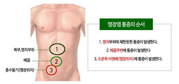 흔히 우리가 맹장염이라고 불리는데, 정확한 명칭은 충수염입니다. 충수염이란 맹장 끝에 6~9cm의 길이로 달린 충수돌기에 염증이 발생하는 것을 말하는데, 이러한 충수염은 발열감, 식은땀, 설사를 일으키기도 하고, 배에 가스가 차는 증상이 생겨 불편함이 느껴지기도 하며, 오른쪽 옆구리와 아랫배에 통증이 갑자기 극심하게 나타납니다. 이러한 충수염은 제때 치료를 하지 않으면 복막염, 복강 내 농양, 장 폐쇄 등 여러 가지 합병증을 유발할 수 있기 때문에, 충수염이 의심된다면 하루빨리 병원에 방문하여 적절한 치료를 받는 것이 좋습니다.