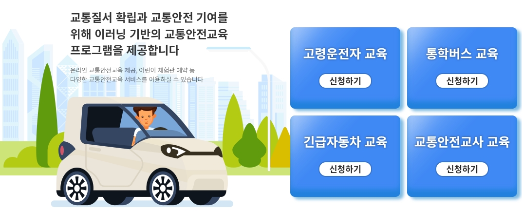 교통안전센터에서는 [고령운전자교육] [통학버스교육] [긴급자동차교육] [교통안전교사교육] 등 온라인 교통안전교육을 제공하고 [어린이 체험관 예약] 등 다양한 교통안전교육 서비스를 이용하실 수 있습니다.