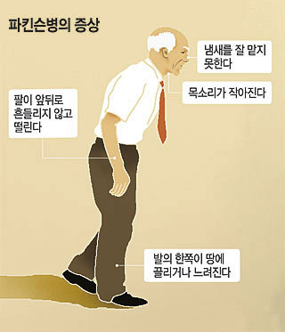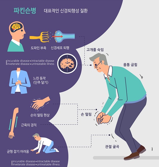 신경 퇴행성 질환은 신경세포들이 소멸하게 되어 이로 인해 뇌기능에 이상이 생기는 것입니다. 고로 파킨슨병은 사지와 몸이 떨리고 경직되는 중추 신경 계통의 퇴행병입니다.
