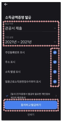 3) 발급이유, 발급기간, 주민등록, 주소, 소득발생, 일용근로소득원천징수 의무자 표시 등에 체크 유무를 하고, 동의하고 발급하기 선택 -> 증명서 파일 내보내기를 통해 관공서 등에 제출 진행