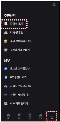 1) 토스 앱을 실행하고 하단 메뉴탭에서 전체 -> 주민센터 -> 증명서 떼기를 클릭합니다.