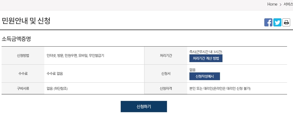 소득금액증명 소득금액증명 정보 신청방법, 처리기간, 수수료, 신청서, 구비서류, 신청자격 정보 제공 신청방법 인터넷, 방문, 민원우편, 모바일, 무인발급기 처리기간 즉시(근무시간 내 3시간)