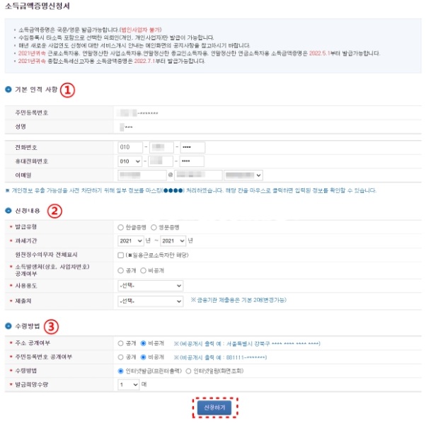4) [기본 인적 사항]은 주민번호 및 성명을 확인 -> 전화번호 및 이메일 입력 [신청내용]에는 한글증명을 선택 -> 증명구분에는 해당되는 항목에 체크 -> 사용용도 및 제출처 선택 [수령방법]에서는 주소 및 주민번호 공개여부 체크 -> 수령방법에 인터넷발급 체크 -> 신청하기 클릭