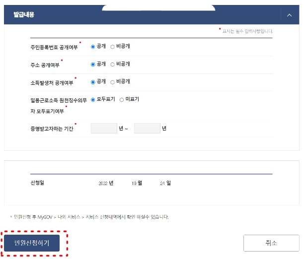 3) 회원 / 비회원 선택 (비회원 발급가능) -> 신청내용, 수령방법, 발급내용을 입력하고 민원 신청하기 클릭합니다.