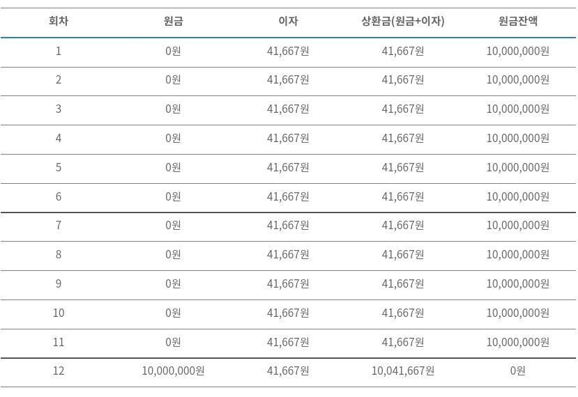 1회차부터 11회차까지 대출금액 천만원에 대한 약정이자 41,667원을 납부하다가 12회차에 원금+이자를 납부하는 방식입니다.