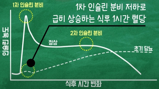 당뇨병 고위험군이나 당뇨병 전 단계 환자에게서 식후 1시간 혈당이 급격하게 올라가는 이유는 당뇨병 초기에는 2차 인슐린 분비는 아직 남아 있는 상태에서 1차 인슐린 분비만 현저히 저하되기 때문입니다. 당뇨가 진행되면 이제는 2차 인슐린 분비까지 사라지게 되고, 이 때는 1시간, 2시간 할 것 없이 혈당이 올라가기 때문에 그제야 비로써 당뇨 발병 사실을 인지하게 되는 경우가 많습니다.