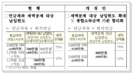 - 연금저축 세액공제 한도액 400만에서 600만원으로 대폭 증가가 되었습니다.