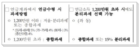 - 연금소득의 경우 1200만원 초과 할경우 종합과세 및 15% 분리과세 에서 선택이 가능합니다.