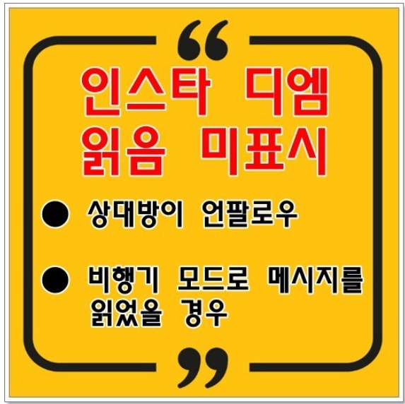 또한 상대방이 팔로우를 했더라도 와이파이나 데이터를 끄고 비행기 모드를 실행한 후 내가 보낸 인스타 디엠을 읽은 경우에도 '읽음' 표시가 메시지 아래에 표시되지 않을 수 있습니다.