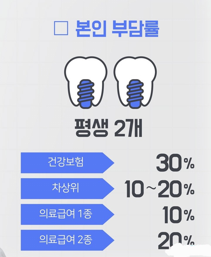 건보가입자분들께서는 임플란트 총비용에서 30%로 납부를 하시면 되며 70%는 지원이 되는데요. 만약 임플란트 가 300만원이라고 가정할 겨우에 이의 대한 30%인 90만원을 납부하시면 되며 210만원은 지원을 받으시는것입니다. 이렇게 금액으로 알아보니 매우 큰금액이라는 것을 알수 있죠? 단, 임플란트 외 다른 치과시술을 받는 것은 해당이 되지 않으니 이를 기억하여 주시기 바랍니다.
