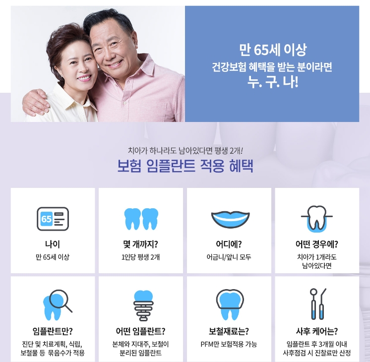 오늘은 65세이상 임플란트 혜택에 대해서 알아보려고 하는데요. 임플란트는 먼이야기 같지만 많은분들이 젊은나이부터 임플란트를 하시는분들이 많습니다. 그만큼 나이가 들어감에 따라 임플란트를 하시는분들이 더욱 많아지시며 65세가 되시면 대부분의 분들이 임플란트를 여러개 하시는분들이 많으신데요. 저희 아버지께서도 벌써 임플란트만 5개를 하셨으며 추후 더욱 많아지실것 같습니다.