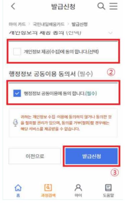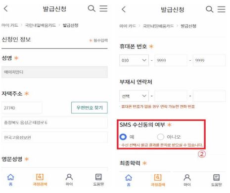 • 성명, 주소, 영문성명, 휴대폰번호, SMS 수신동의 여부, 최종학력, 카드발급구분, 제휴카드, 카드유형, 카드발급(신청)방법 등을 작성 후 신청합니다.