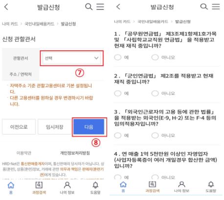 6) 지원대상 및 배송지를 입력하고 신청 관할관서를 클릭하면 주소지 기준으로 하고 발급신청자격 항목을 체크합니다. 안내문 동의 및 행정정보 공동이용 동의 후 발급 신청을 하면 모바일 발급 신청이 끝나게 됩니다.