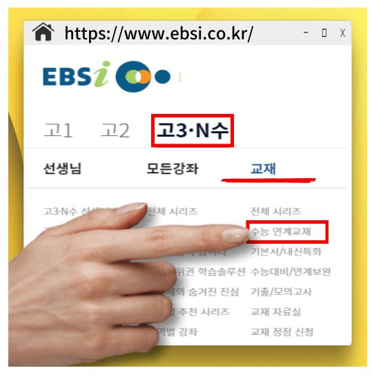 - 다음으로, [고3·N수 > 교재 > 수능연계교재] 카테고리 메뉴를 순차적으로 클릭합니다.