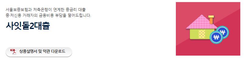 | 사잇돌2대출 | 연 9.9% ~ 19.9% | 약정이자 + 3% | - 당행의 금리정책과 고객신용도에 따라 차등금리 적용 - 연체금리는 저축은행법의 제한이자율 범위내에서 적용 |