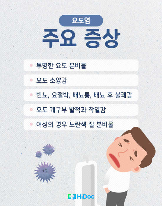 요도염의 주된 증상으로는 요도의 불편함, 가려움증, 요도에서 나오는 경미한 분비물, 요도를 만질 때 평소와 다른 통증, 요도 입구가 달라붙어 있다가 소변을 볼 때 열리는 느낌, 소변 시 작열감, 소변 시 잔뇨감 등이 나타날 수 있습니다.