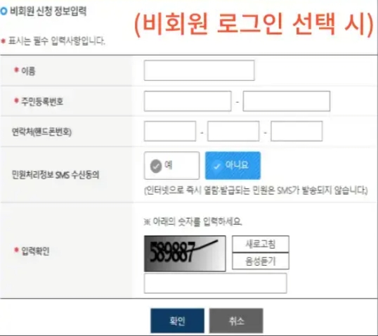 - 신청인 정보 입력(이름 / 주민등록번호 / 연락처 등)