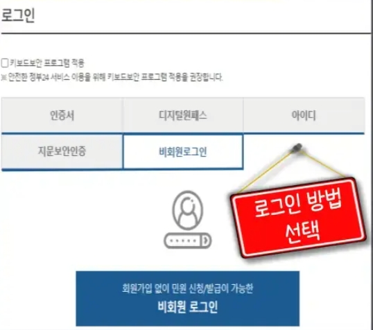 | 정부24 | 홈페이지 | 공동인증서 금융인증서 간편인증 아이디인증 디지털패스 지문보안인증 비회원로그인 중 택일 |