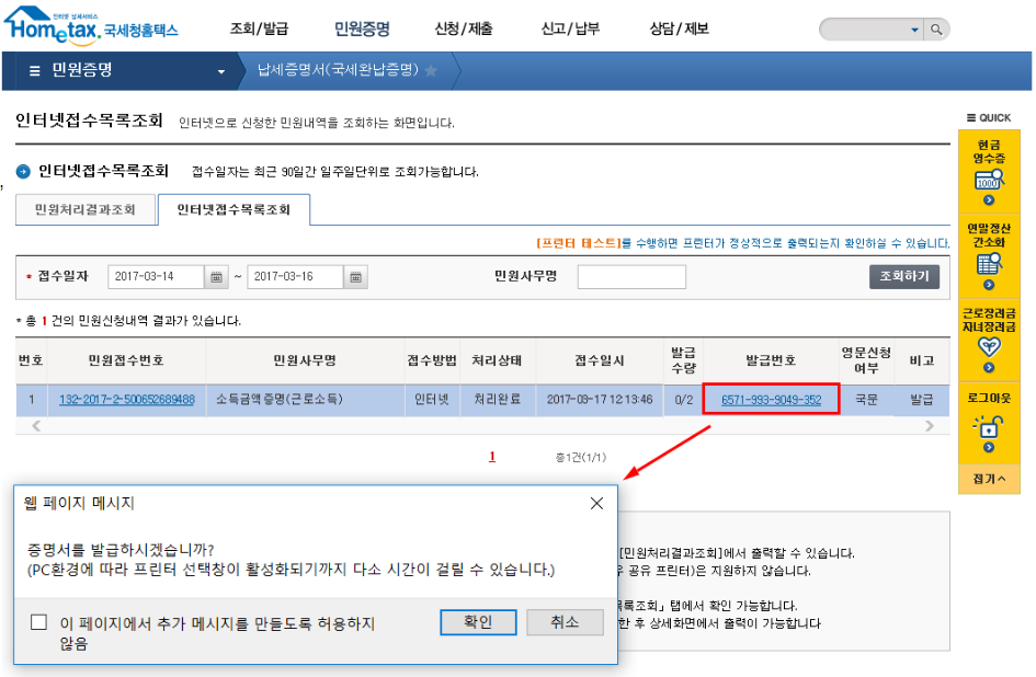 6) 인터넷접수목록조회에서 발급된 소득금액증명원을 확인합니다.