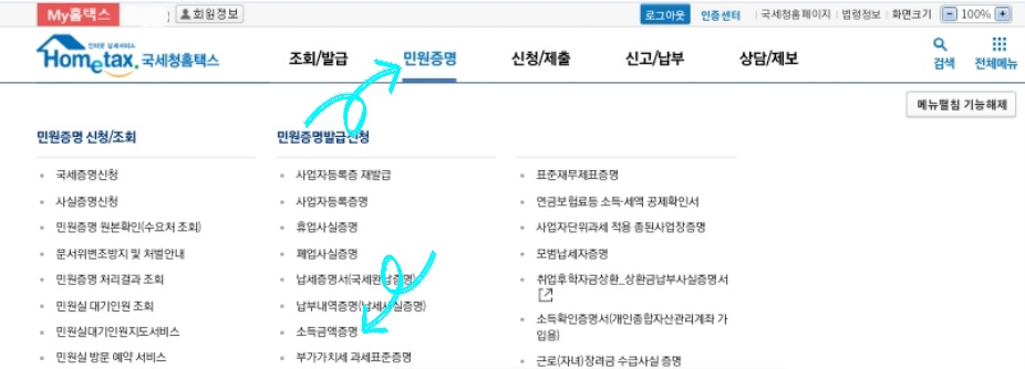 2) 홈택스 상단에 [민원증명] -> [소득금액증명]을 클릭합니다.