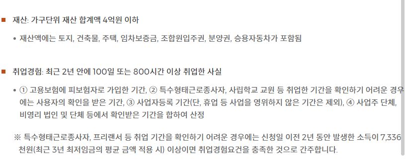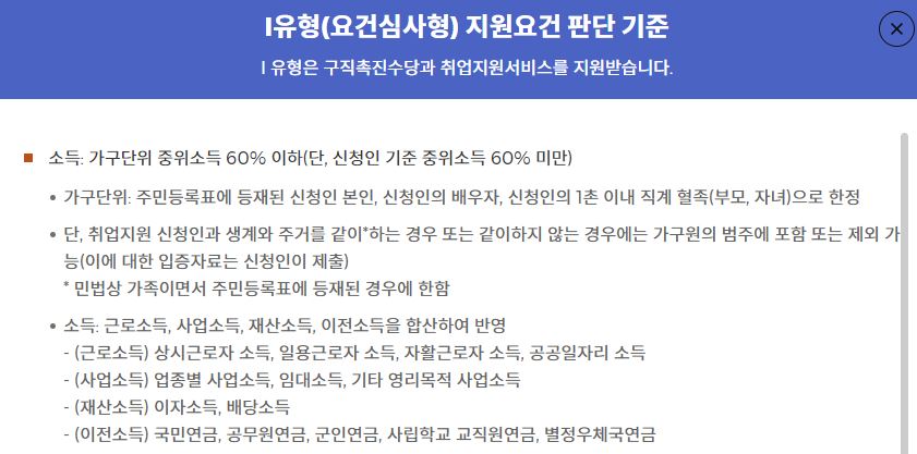 - 국가 또는 지방자치단체가 구직활동에 필요한 비용을 지원하는 수당이 월 평균 지원금액 50만원 이상이거나 총 지원액 총 지원액 300만원 이상인 사업에 참여중이거나 수급 종료 후 6개월이 지나지 않은 사람