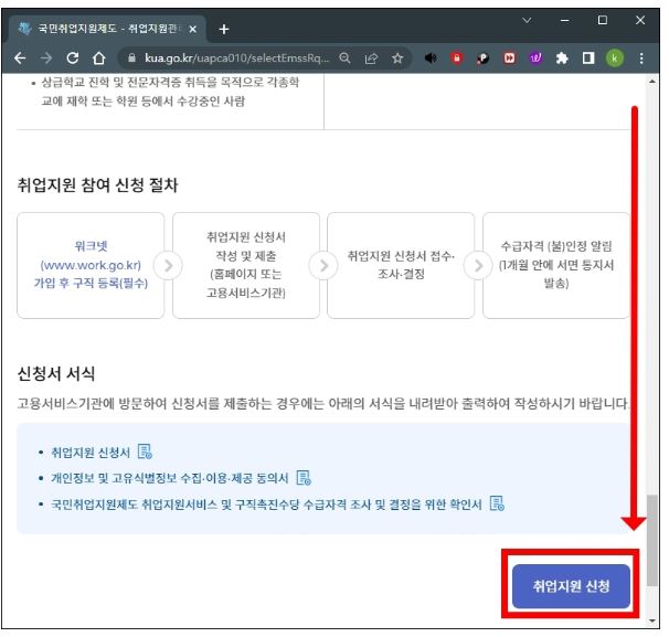 4) 수급자격 및 지원내용, 제출서류 등을 확인 후 스크롤을 아래로 내려서 [취업지원 신청]을 클릭합니다.