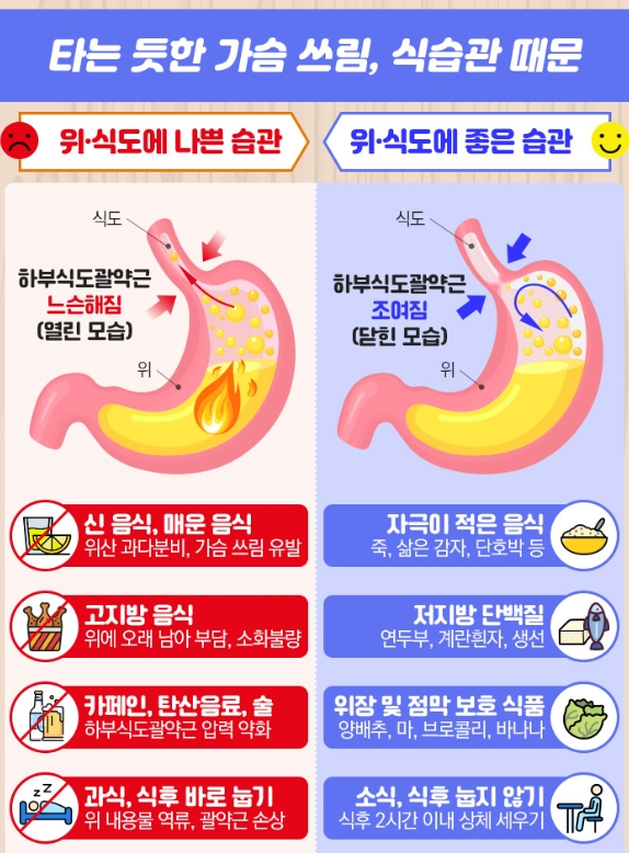 역류성 식도염은 현대인을 괴롭히는 대표적인 소화기질환으로, 위산이나 위의 음식물이 역류하여 식도에 염증을 일으키는 질환으로 단순히 위산의 과다로 발생하기도 하지만, 다양한 위장의 기능 문제로 인해 발생할 수 있습니다. 특히 하부식도 괄약근이 느슨해지거나 기능이 떨어지면 위산이 식도로 역류하면서 식도 점막이 손상되고, 염증이 발생하면서 다양한 증상으로 나타나게 됩니다.