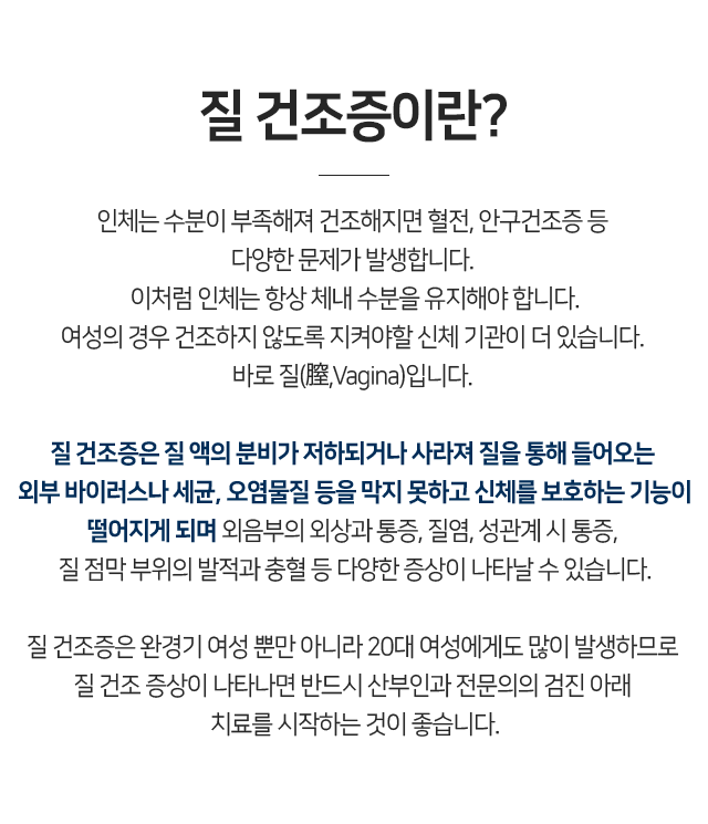 질 건강은 자궁, 방광, 난소 등까지 영향을 미치며, 질에서는 여성에게 흔한 감기라고 불리는 질염을 비롯하여 질건조증, 질이완증, 요실금, 방광염 등 다양한 문제가 생길 수 있기 때문입니다. 그렇다면 오늘의 주제인 질건조증이란 무엇일까요?