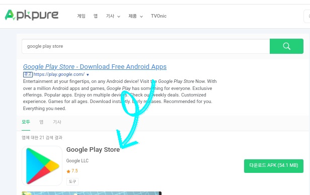 apkpure에서 플레이스토어를 받아서 설치를 별도로 해주는 방법이 있어요. 플레이스토어 설치파일이 있는 자료실은 많이 있지만 이중에는 신뢰할 수 없는 파일이 올라오는 경우가 있져. 그렇기에 검증된 파일이 있는 자료실을 선택하는 것이 중요해요