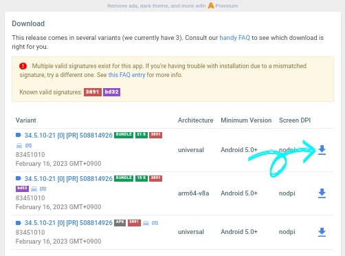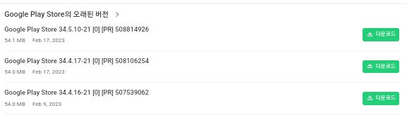 4) 구버전 플레이스토어를 다운받으려면 구글플레이스토어 다운로드를 누르지 마시고 아래 화살표 모양을 눌러주셔서 아래로 스크롤을 내리시면 2번째 사진처럼 구버전을 다운로드 받으실 수 있습니다.