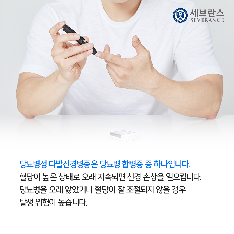 당뇨병으로 인한 고혈당은 혈관과 신경을 손상할 수 있으며 특히 다리와 발에 가장 자주 발생하고 손에서도 증상이 나타날 수 있을 뿐만 아니라 신체의 장기에도 영향을 미칠 수 있습니다. 신경은 감각과 통증, 온도 등에 대한 신호를 뇌와 주고받으며 우리 몸을 제어합니다. 또한, 음식을 소화하고 소변을 배출하는 신체의 기능 제어하며 근육에 언제 어떻게 움직여야 하는지를 전달합니다.