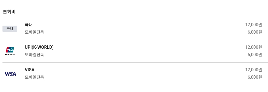 모바일 단독카드(국내전용(Local), 국내외겸용(Visa, K-WORLD(UPI타입))) 6천원(기본연회비 1천원 + 제휴연회비 5천원)