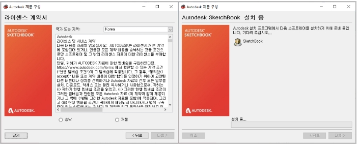 2) 오토데스크 스케치북 셋업 클라이언트가 실행되며 라이센스 약관 [승낙]을 체크하시고 [다음]을 눌러서 설치를 진행합니다.