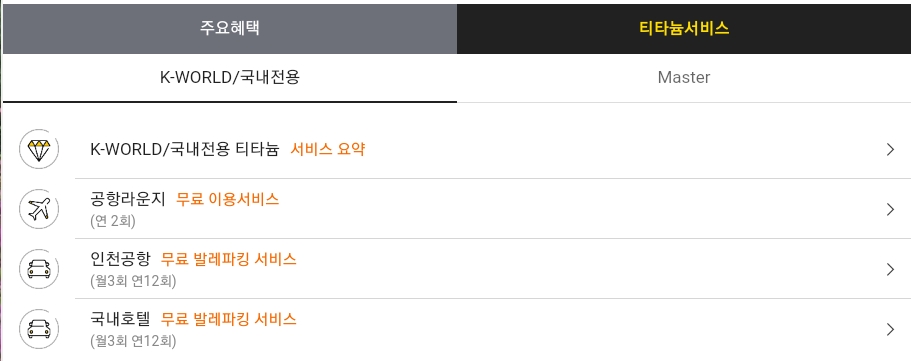 라운지 안내데스크에서 탑승권 및 마스터티타늄카드 또는 K-WORLD티타늄카드를 제시하여 이용 가능여부 확인 후 입장본 서비스는 실물카드의 마스터티타늄 로고 또는 K-WORLD티타늄 로고 확인 후 서비스가 제공되므로 티타늄카드 실물을 지참하여 주시기 바랍니다.