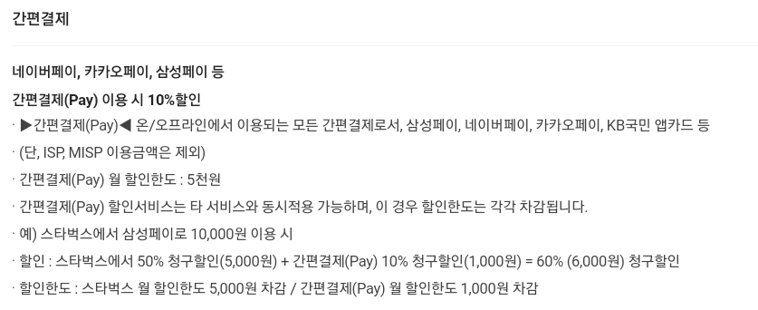 전월 이용실적 30만원 이상 간편결제(Pay) 월 할인한도 5천원
