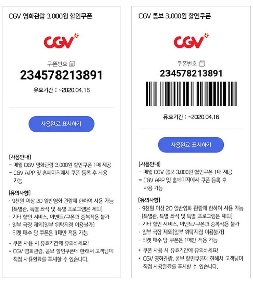 - 이용방법 : CGV 홈페이지/App에서 쿠폰 등록 후 사용 / 콤보는 오프라인 매장에서 결제 시 직원에게 쿠폰 번호 제시