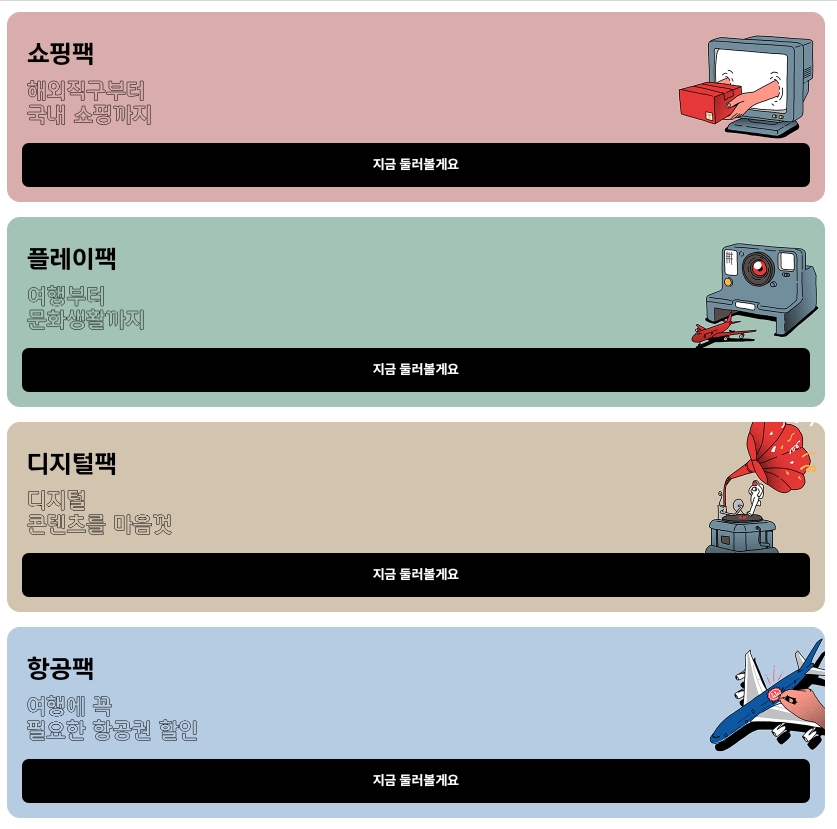 - 취향대로 고르는 핵심 혜택 패키지 정기 구독(원하는 혜택을 한 번만 결제하면 알아서 챙겨드립니다.)