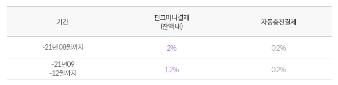 - 결제대금 부족분에 대해 1만원 단위 자동 충전 시 자동 충전으로 결제된 거래건은 기본 적립률이 적용됩니다.