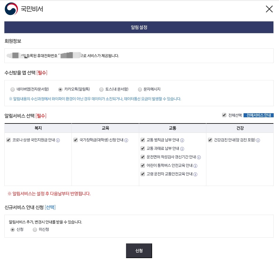저는 국민지원금 이외에도 필요한 알림서비스를 다 선택했습니다. 돈 드는 것도 아닌데 알림 받아서 나쁠거 없다고 생각했습니다.
