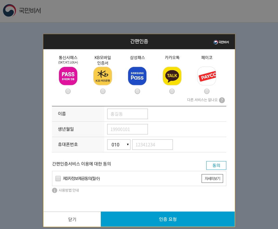 저는 카카오톡으로 간편인증 하였는데 이름, 생년월일, 휴대폰번호 입력 후 인증 요청하였습니다.
