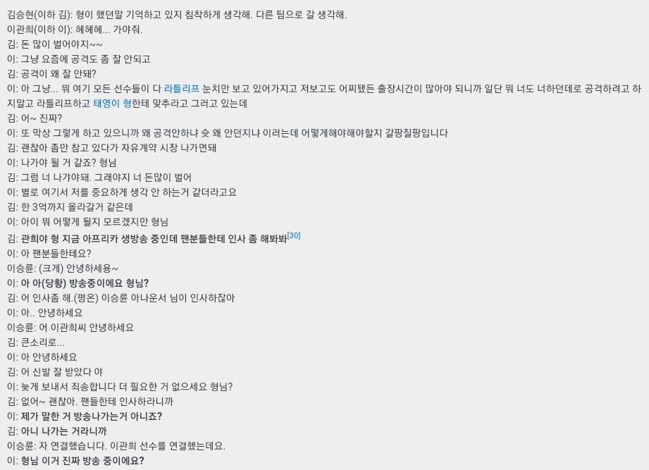 이관희는 계속해서 "제가 말한거 방송나가는거 아니죠?"라며 크게 당황했지만 김승현은 심드렁하게 "아니 나가는거라니까"라고 대답하였고 이후 난리가 났지만 김승현은 자신이 무엇을 잘못했는지를 모르는 반응을 보였습니다.