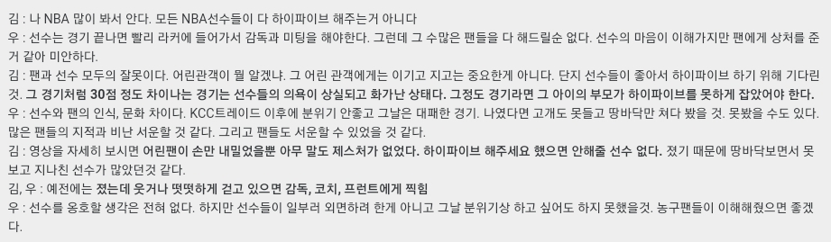 우지원과 함께 진행하는 팟캐스트 "우지원 김승현의 농구농구"에서 녹음된 내용인데 2019년 11월 23일에 일어났던 전주 KCC 이지스의 팬 서비스 논란에 대한 발언입니다. 본문을 보면 두 명의 잘잘못을 떠나 우지원은 비교적 조심스럽게 얘기하며 에둘러 표현하려고 애쓰는 반면, 김승현은 팬의 잘못이 존재한다고 정확히 지적하며 논란이 커졌고 해당 발언을 통해 농구 커뮤니티와 기사를 통해 팬들의 비판을 받고 있는 상태입니다.