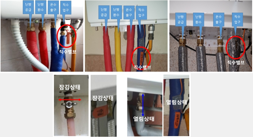 2.동절기가 아닌 경우 찬물은 나오지만 온수쪽 물이 전혀 한방울도 안나오는 경우라면 보일러 본체와 연결된 4개의 배관 중 보일러를 마주 보시는 방향에서 오른쪽 첫번째 배관이 직수(냉수)배관이며, 밸브가 열려 있어야 합니다.