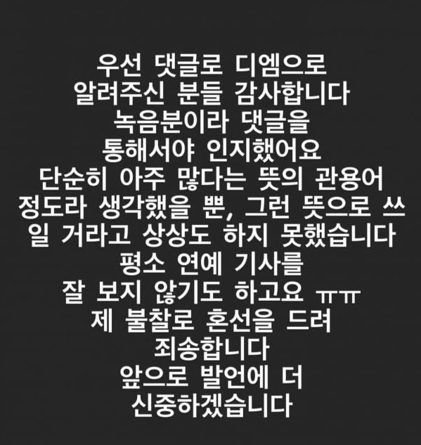 "우선 댓글로 디엠으로 알려주신 분들 감사합니다. 녹음분이라 댓글을 통해서야 인지했어요. 단순히 아주 많다는 뜻의 관용어 정도라 생각했을 뿐, 그런 뜻으로 쓰일 거라고 상상도 하지 못했습니다. 평소 연예 기사를 잘 보지 않기도 하고요 ㅠㅠ 제 불찰로혼선을 드려 죄송합니다. 앞으로 발언에 더 신중하겠습니다" 이렇게 사과문을 남겼으며 현재는 인스타에서 삭제된 상태입니다.