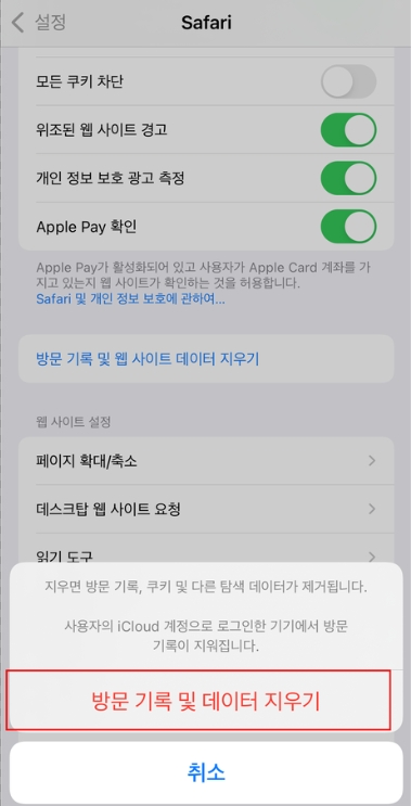 아이폰 방문기록 및 웹 사이트 데이터 지우기